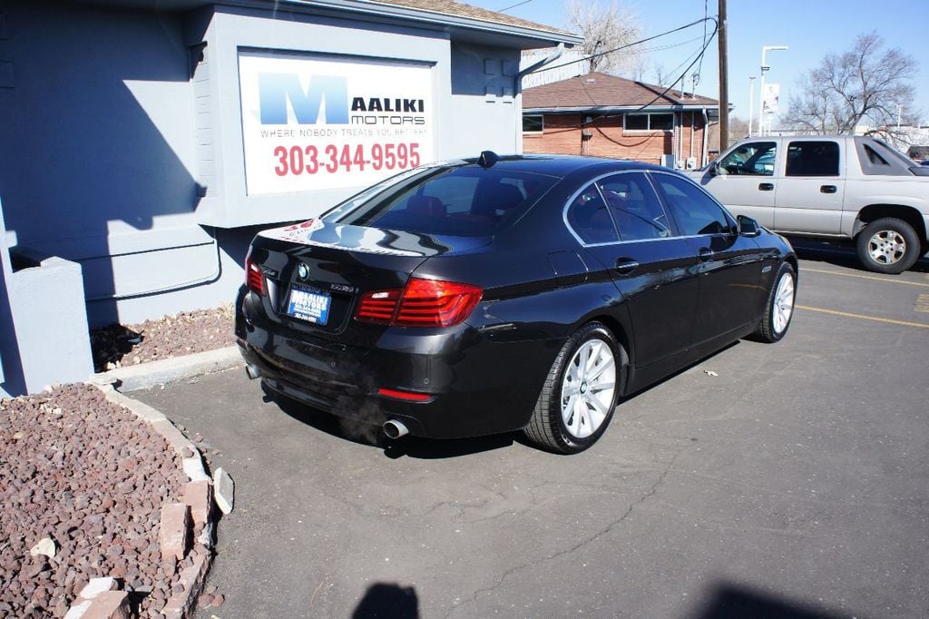 Two cars parked in front of a brick house.