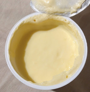 A close-up image of a plastic container filled with a yellow, creamy substance. The container has a lid that is partially open, revealing the contents. The yellow substance appears to be a type of yogurt or custard, and it is smooth and uniform in texture. The container is placed on a surface with a light background, and the lighting is soft and diffused, highlighting the texture of the substance.