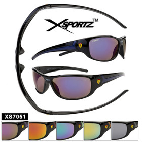 A pair of sunglasses with a sleek design, featuring a shiny black frame and mirrored lenses. The sunglasses have a curved shape with a metallic hinge on the left side and a metal tip on the right side. The lenses are tinted with a reflective silver coating, and the frame has a smooth finish with a subtle texture.