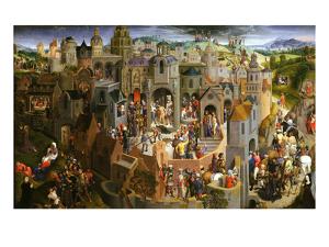 A detailed Renaissance painting depicting a bustling medieval village scene with numerous figures engaged in various activities. The painting is rich in color and detail, showcasing a variety of architectural styles and a dense crowd of people. The scene is set against a backdrop of a hilly landscape with a castle in the distance.