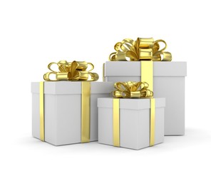 Two identical white gift boxes with golden ribbons are placed side by side against a white background.