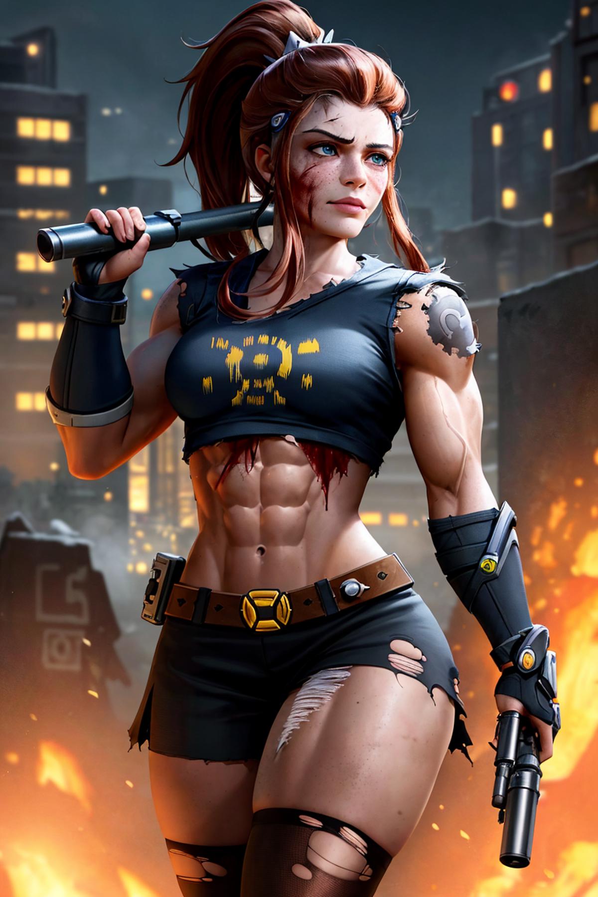 dark night scene, best quality, 1girl, (upper body:1.2), digital illustration, beautiful shapely woman (corneo_brigitte:1.3), (ragged and (torn short_black_skirt:1.2) and ragged and (torn blue sleeveless shirt:1.2) and tactical gear:1.3), standing in the dark, (dynamic pose), (beautiful face with scratches), (zombie crowd around her), (bloodstains and bite marks on her skin:1.2), (soft skin color), (deep blue eyes), (athletic:1.3), (wide hips:1.1), (thick thighs:1.1), (night zombie city in detailed background:1.3), (nixeu_white:0.7), (nixeu_extra:0.7), dark aesthetic, (medium size boobs:0.8), heavy breathing, (angry smirk), (horror atmosphere), (Resident Evil 3 Remake), film grain, lens distortion, (chromatic aberration), erotic, (muscular:0.7), torn tights, (elbow protection pad),