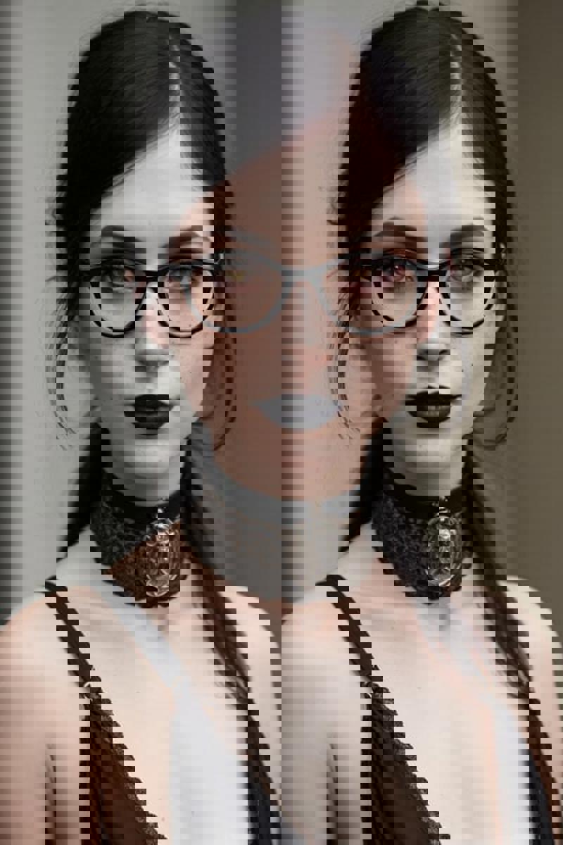 (photograph, photographic, photogenic, rule of thirds) full length body portrait of brunette woman with (freckles on face), (glasses), long messy brown hair, symmetrical, pouty lips smile, black collar