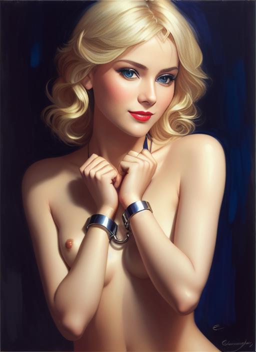 (handcuffs:1.3), (nude:1.2), (cuffed wrists:1.3), blonde hair, medium hair, blue eyes, eyeshadow, beautiful russian woman, kneeling, (seductive smile:1.2), red lipstick, (sexy:1.4), professional majestic oil painting by Ed Blinkey, Mikhail Vrubel, Atey Ghailan, Jeremy Mann, Greg Manchess, (WLOP:1.2), Charlie Bowater, trending on ArtStation, trending on CGSociety, Intricate, High Detail, soft lighting, sharp focus, dramatic, photorealistic, black background, masterpiece, best quality