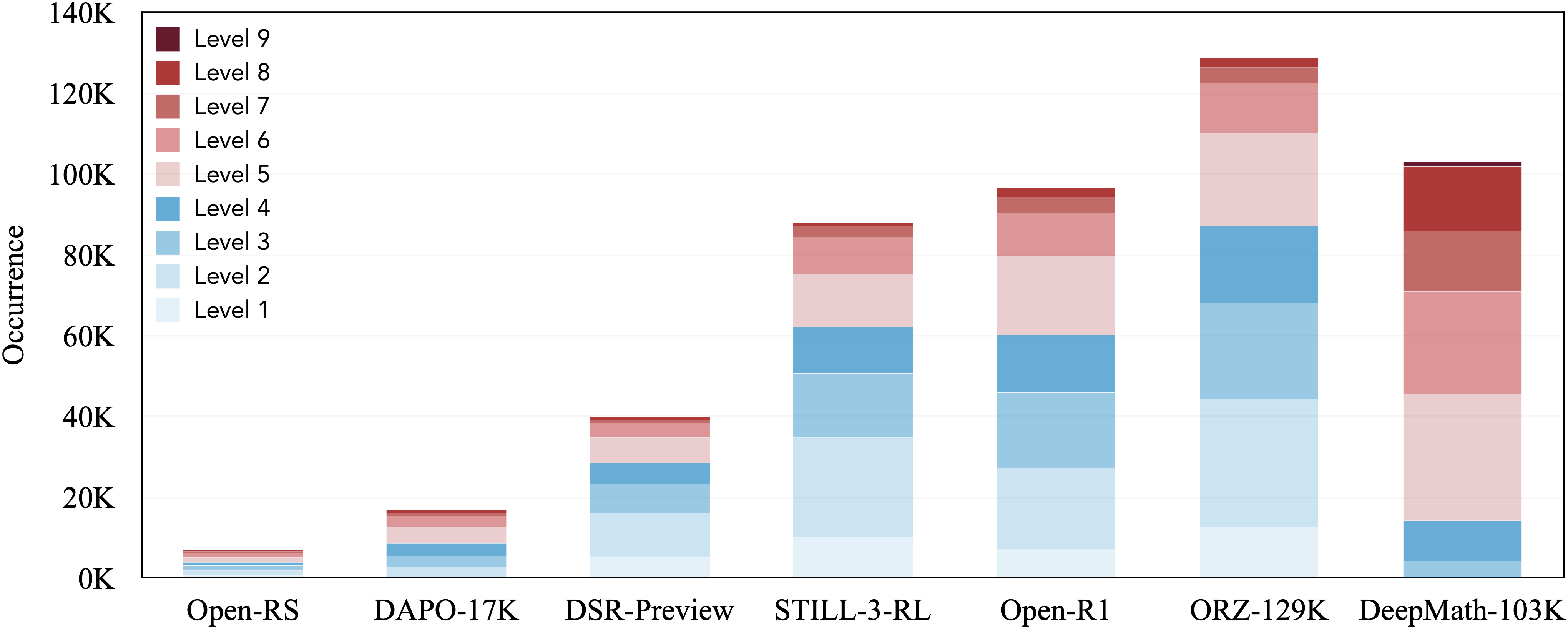 1. Challenging Problems: DeepMath-103K has a strong focus on difficult mathematical problems (primarily Levels 5-9), significantly raising the complexity bar compared to many existing open datasets.