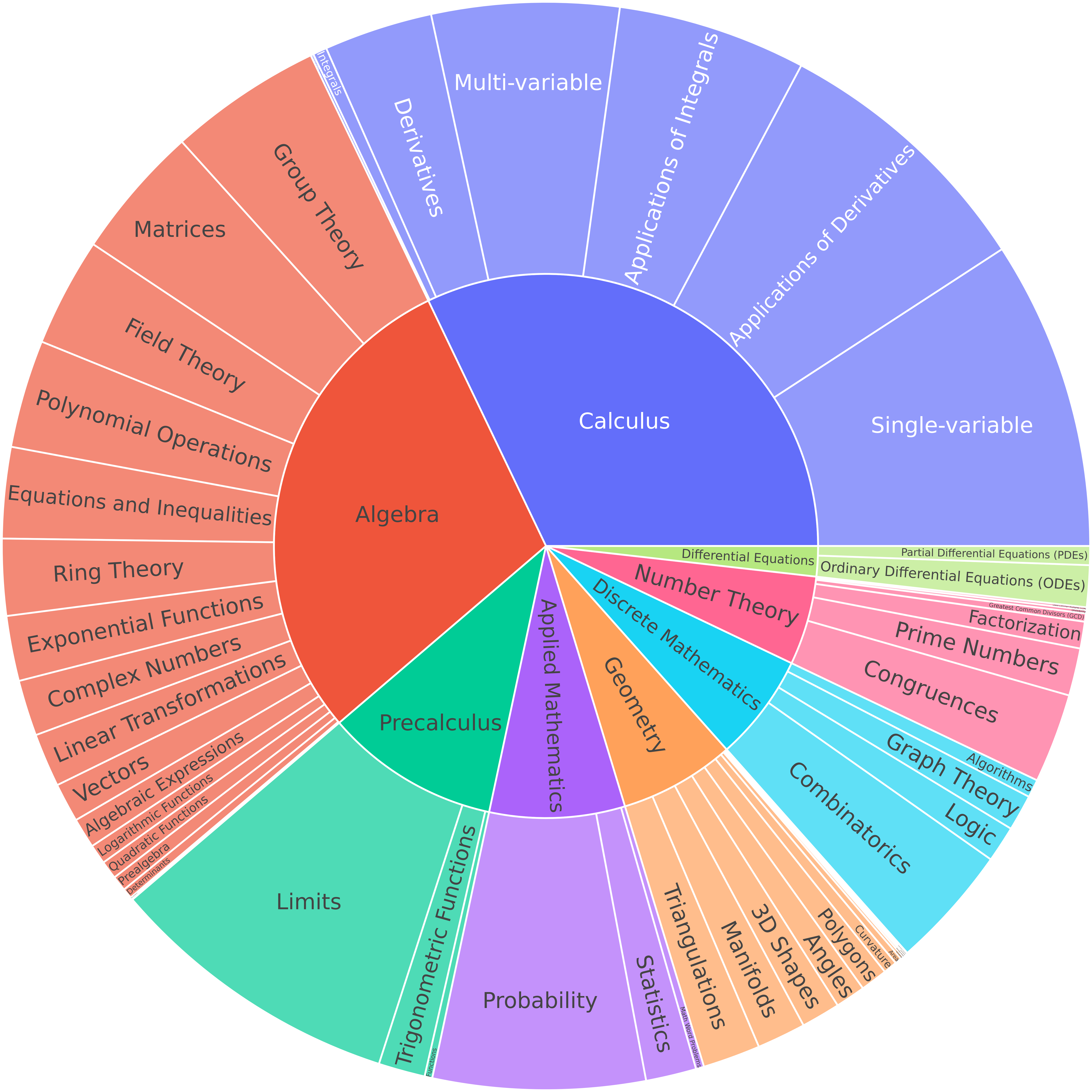 Hierarchical breakdown of mathematical topics covered in DeepMath-103K.
